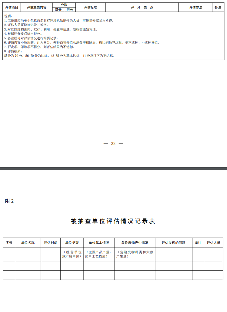 (二)地方評(píng)估。省級(jí)生態(tài)環(huán)境部門對市級(jí)生態(tài)環(huán)境部門的評(píng)估,可結(jié)合本省(區(qū)、市)實(shí)際,參照《評(píng)估指標(biāo)》附表 1 執(zhí)行,具體指標(biāo)可適當(dāng)調(diào)整。各級(jí)地方生態(tài)環(huán)境部門按照《評(píng)估指標(biāo)》附表 2、3 對產(chǎn)廢單位和經(jīng)營單位進(jìn)行評(píng)估,并填寫《評(píng)估情況記錄表》(見附 2)。固體廢物管理、環(huán)境執(zhí)法、環(huán)境影響評(píng)價(jià)、排污許可等部門要對危險(xiǎn)廢物規(guī)范化環(huán)境管理評(píng)估工作做好必要的政策指導(dǎo)。有條件的地區(qū),可以采取購買第三方服務(wù)等方式,為危險(xiǎn)廢物規(guī)范化環(huán)境管理評(píng)估工作提供技術(shù)支撐。