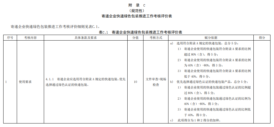 附錄C的考核評價表總分為100分,寄遞企業(yè)可依據(jù)賦分細(xì)則對每一條款進行評分。