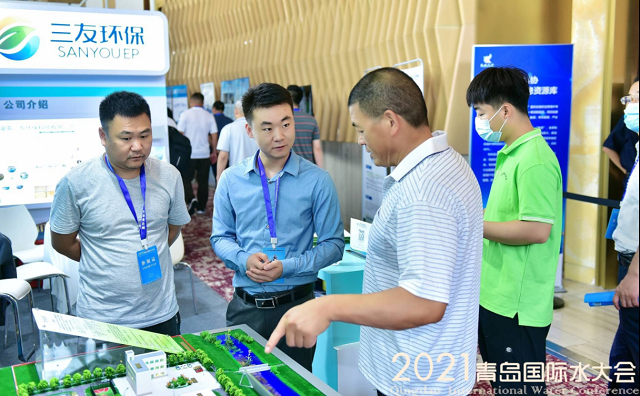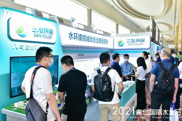 2021青島水國際大會現(xiàn)場三友環(huán)保展臺前觀眾參觀