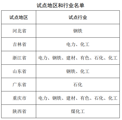 試點行業(yè)為電力、鋼鐵、建材、有色、石化和化工等重點行業(yè),試點地區(qū)根據(jù)各地實際選取試點行業(yè)和建設(shè)項目(詳細(xì)名單見附件1)。除上述重點行業(yè)外,試點地區(qū)還可根據(jù)本地碳排放源構(gòu)成特點,結(jié)合地區(qū)碳達(dá)峰行動方案和路徑安排,同步開展其他碳排放強度高的行業(yè)試點。