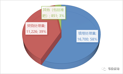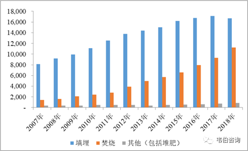 2018年,我國城市生活垃圾無害化處理量達到28,778萬噸,其中填埋處理量16,700萬噸,焚燒處理量11,226萬噸,其他(包括堆肥)處理量851萬噸。