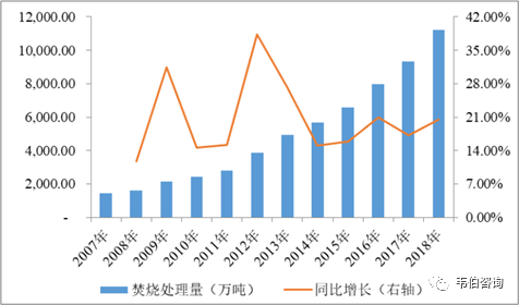 隨著城市生活垃圾“減量化、資源化、無害化”處理需求的日益增長,我國垃圾焚燒處理近年來發(fā)展迅速。據(jù)住房和城鄉(xiāng)建設(shè)部統(tǒng)計:2007年至2018年,我國城市生活垃圾焚燒廠年實際處理量從1,446萬噸增長到11,226萬噸,復(fù)合增長率達20.48%。