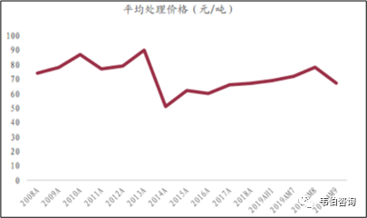 圖表12:2008-2019年新增垃圾焚燒發(fā)電項目價格變化趨勢(元/噸)