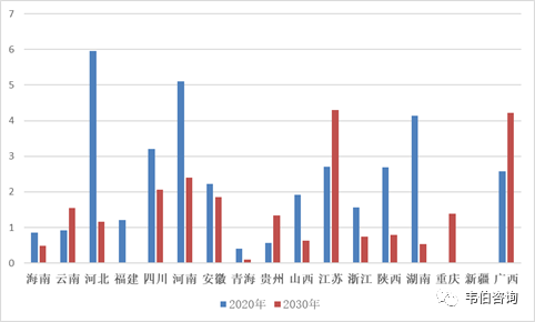 圖表15:截止2020年底和2030年底各省垃圾焚燒中長期規(guī)劃新增項目產(chǎn)能(萬噸/日)