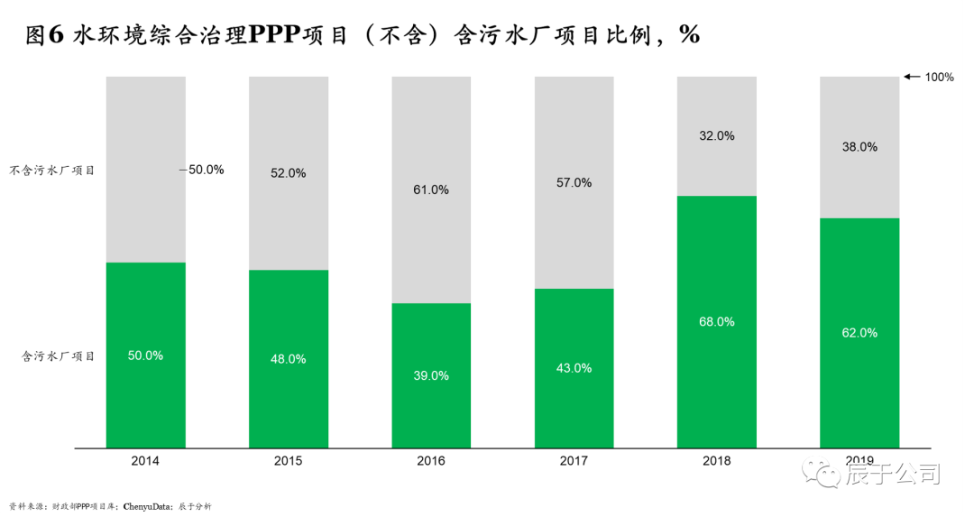 此外,我們也看到,越來越多的單一污水項目逐漸融入到水環(huán)境綜合治理及長江、黃河的流域保護治理中,尤其是2017年P(guān)PP清庫開始后,含有污水廠建設(shè)運營的水環(huán)境綜合治理項目占比明顯增加,相比2017年之前的不到50%,2018、2019連續(xù)兩年這一比重都超過60%(見圖6)。