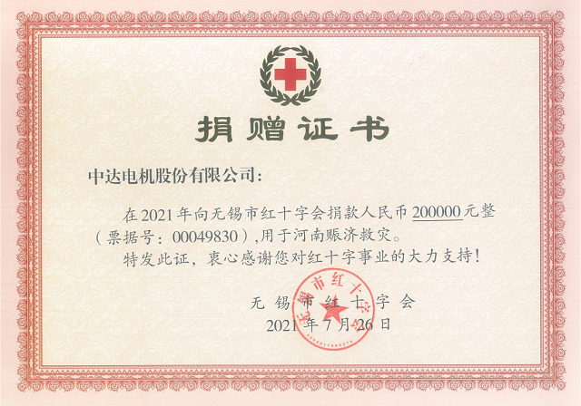 近日,河南暴雨成災(zāi),特別是鄭州、新鄉(xiāng)等地受災(zāi)嚴(yán)重,牽動(dòng)著全國(guó)人民的心。中達(dá)電機(jī)股份有限公司一直心系救援情況和受災(zāi)群眾,通過(guò)無(wú)錫紅十字會(huì)向河南捐款人民幣200000元整,用于物資采購(gòu)及災(zāi)后重建工作。中達(dá)電機(jī)股份有限公司愿災(zāi)區(qū)群眾能夠早日恢復(fù)正常生活,并向所有奮戰(zhàn)在一線搶險(xiǎn)救援的工作人員和組織機(jī)構(gòu)致以最崇高的敬意!