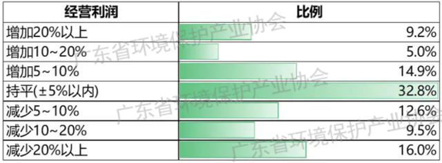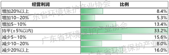 營業(yè)利潤方面,29.1%的環(huán)保企業(yè)實現(xiàn)利潤同比增長,32.8%的企業(yè)利潤與上年同期持平,38.1%的企業(yè)利潤下降。