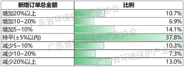 新增訂單總金額方面,31.7%的環(huán)保企業(yè)表示新增訂單總金額相比上年同期增加,37.8%的企業(yè)表示同比基本持平, 30.5%的企業(yè)反映新增訂單總金額減少。