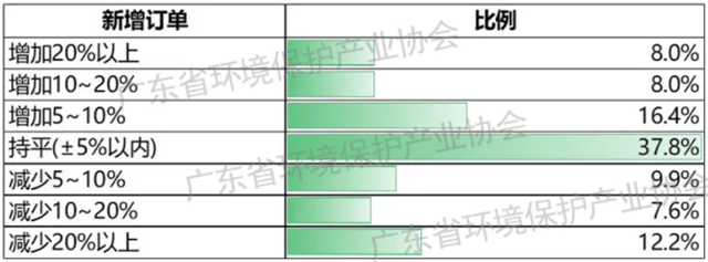 新增訂單方面,32.4%的環(huán)保企業(yè)認為較去年同期增加,37.8%的企業(yè)同比基本持平,29.8%的企業(yè)反映新增訂單減少。