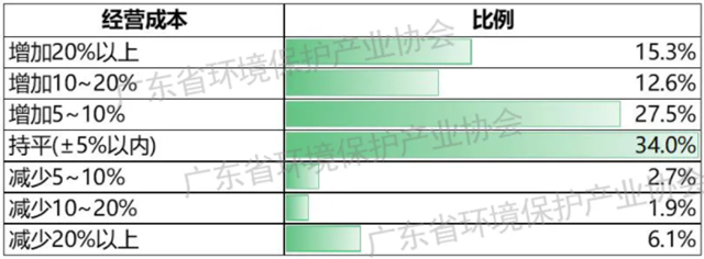 經(jīng)營成本方面,環(huán)保企業(yè)經(jīng)營成本普遍上升。調(diào)查企業(yè)中,55.3%的環(huán)保企業(yè)反饋成本同比上升,34.0%的環(huán)保企業(yè)基本持平,僅有10.7%的企業(yè)反饋成本下降。