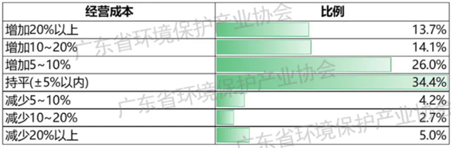 經(jīng)營成本方面,環(huán)保企業(yè)經(jīng)營成本普遍上升。調(diào)查企業(yè)中,53.8%的環(huán)保企業(yè)反饋成本同比上升,34.4%的環(huán)保企業(yè)基本持平,僅有11.8%的企業(yè)反饋成本下降。