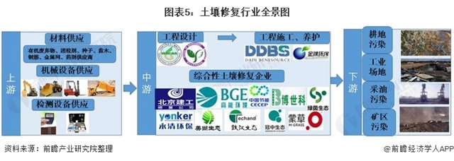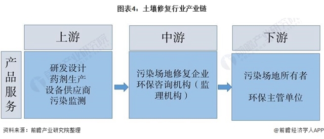 土壤修復行業(yè)上游包括相關(guān)藥劑和設(shè)備的研發(fā)設(shè)計、藥劑生產(chǎn)商、設(shè)備供應商及土壤污染監(jiān)測商,為土壤修復提供設(shè)備技術(shù)支持;行業(yè)下游通常為受污染場地的所有者或環(huán)保主管單位,土壤修復項目由下游企業(yè)提出并為項目出資。行業(yè)中游為一些土壤修復企業(yè)和環(huán)保咨詢機構(gòu)。中游企業(yè)負責受污染地塊的前期調(diào)查、風險評估,中后期工程實施、竣工驗收以及后期的評估工作。