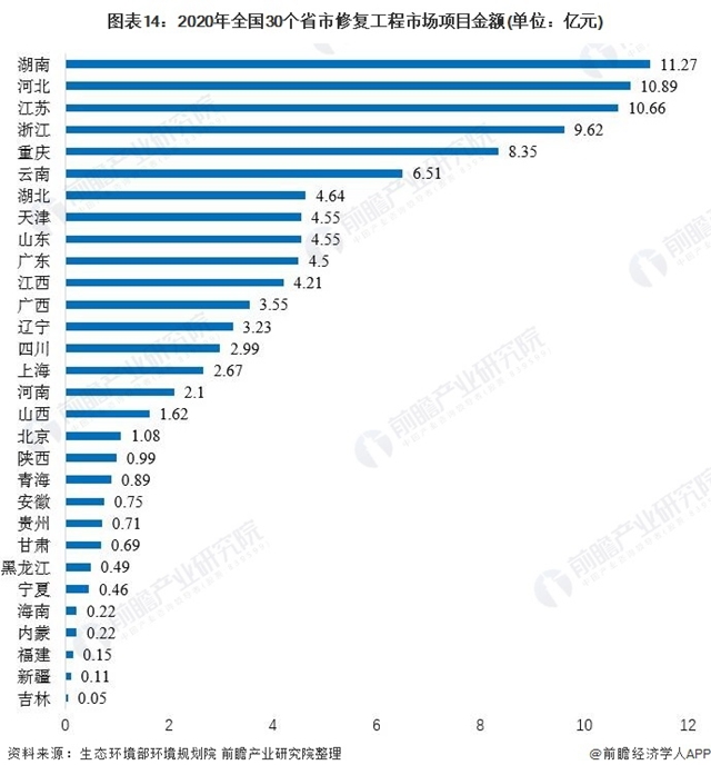 從土壤修復工程項目金額來看,2020年湖南省啟動的工程項目金額最高,達到11.27億元;排在前2-6名的省份分別是河北、江蘇、浙江、重慶、云南。6省項目金額較高,均在5億元以上。