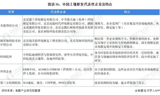 目前國內(nèi)從事土壤修復的企業(yè)越來越多,用“雨后春筍”來形容毫不為過。由于預期土壤修復市場規(guī)模巨大,各行各業(yè)都開始往這方面發(fā)展。從產(chǎn)業(yè)鏈角度看,我國土壤修復行業(yè)既有綜合性企業(yè),也有專注于修復咨詢、技術(shù)支撐、調(diào)查評估、修復工程、第三方檢測,甚至學術(shù)研究、地質(zhì)礦山、土壤肥料、土方工程、植物營養(yǎng)等某一方面的企業(yè)和機構(gòu)。