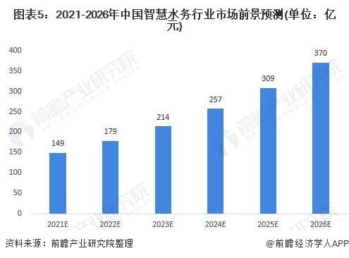隨著我國智慧城市建設的推進,供水現(xiàn)狀、以及水務管理中存在的問題(包括水務管理過程中控制漏損等問題),為智慧水務營造了發(fā)展環(huán)境。而智慧水務還有很大的市場可開發(fā),如智慧水務行業(yè)的發(fā)展正在積極探索如何實現(xiàn)與人工智能的結合,進一步實現(xiàn)人機交互的綜合應用,未來我國智慧水務前景可觀。預計到2026年,我國智慧水務行業(yè)的市場規(guī)模將達到370億元。