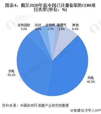從項目類型來看,截至2020年底,我國已注冊備案的CDM項目主要集中于風能、水力等領域,兩者項目達2834個,占比達78.7%。