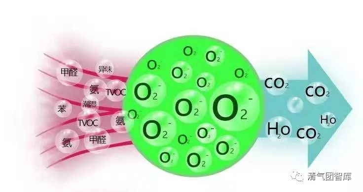 負離子與氣體分子(原子)發(fā)生非彈性碰撞,發(fā)生激發(fā)、離解、電離等一系列反應(yīng),使氣體處于活化狀態(tài)而產(chǎn)生的活性自由基以活化污染物分子,分子發(fā)生斷裂而被分解,最終可將惡臭氣體轉(zhuǎn)化為 CO2,H2O 等空氣中常態(tài)分子。