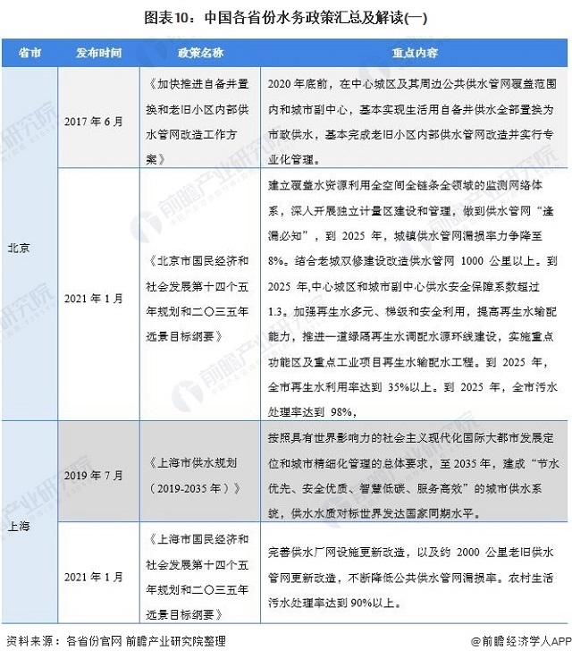 目前,我國(guó)各省市均出臺(tái)了水務(wù)相關(guān)的“十四五”政策規(guī)劃,在供水、污水處理、再生水利用等方面做出了規(guī)劃。除此之外,上海和天津還發(fā)布了至2035年的供水規(guī)劃政策,政策內(nèi)容均落實(shí)了安全、節(jié)水的主旨: