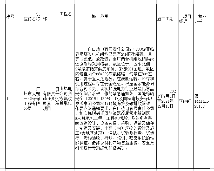 白山熱電有限責任公司脫硝還原劑液氨改尿素工程總承包項目中標公告