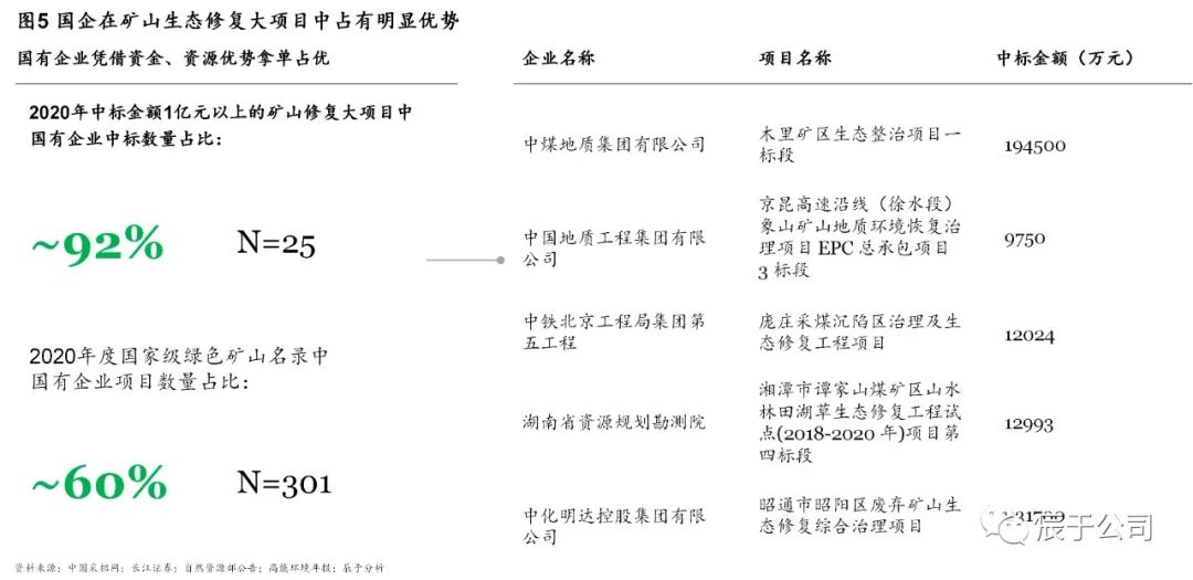 這四類企業(yè)中,具有國(guó)資背景的企業(yè)在大項(xiàng)目中標(biāo)占有明顯優(yōu)勢(shì),據(jù)不完全統(tǒng)計(jì),2020年中標(biāo)金額1億元以上的礦山生態(tài)修復(fù)大項(xiàng)目中,90%以上為國(guó)有企業(yè);301個(gè)國(guó)家級(jí)綠色礦山名錄中,60%以上是國(guó)有企業(yè)(見圖5)。