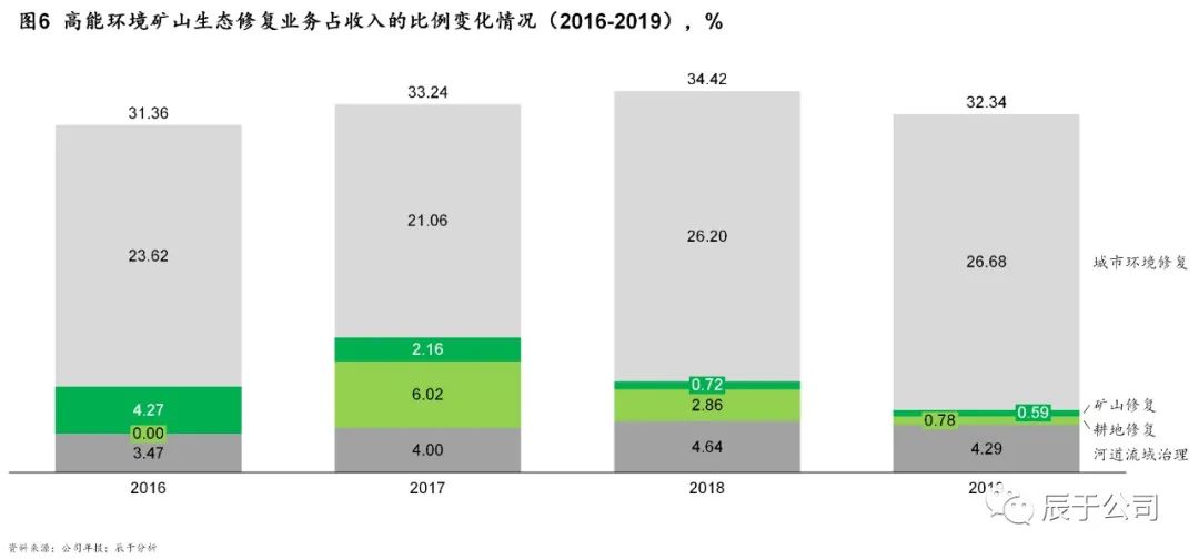 由于市場(chǎng)潛力并未有效釋放,領(lǐng)先的土壤修復(fù)企業(yè)參與這一市場(chǎng)較為謹(jǐn)慎,包括高能環(huán)境、中科鼎實(shí)、建工修復(fù)等龍頭在礦山生態(tài)修復(fù)領(lǐng)域的參與項(xiàng)目很少。以高能環(huán)境為例,近年來礦山生態(tài)修復(fù)占總收入的比重不升反降,2016年這一數(shù)字為4.27%,2019年則僅為0.59%(見圖6)。