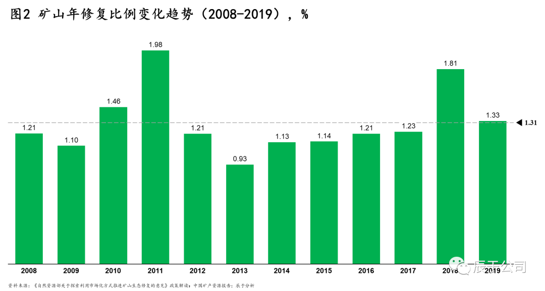 根據(jù)辰于測(cè)算,我國(guó)礦山生態(tài)修復(fù)市場(chǎng)未來十年的潛在空間6500億元以上,然而這一潛在市場(chǎng)一直并未有效釋放,過去十年我國(guó)每年礦山生態(tài)修復(fù)面積的比例均不高于2%,形勢(shì)并不樂觀。