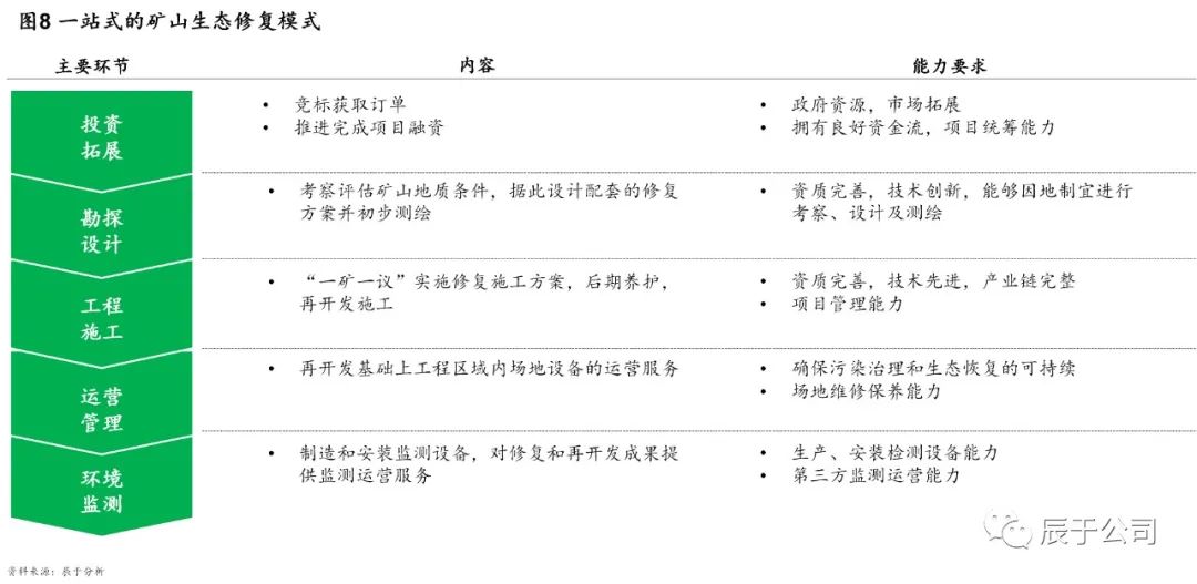 參考國(guó)際成熟經(jīng)驗(yàn),我們認(rèn)為未來EPC仍然是主流模式。不過隨著推進(jìn)大礦山生態(tài)修復(fù)勢(shì)在必行,預(yù)計(jì)PPP項(xiàng)目數(shù)量將有所增加,尤其是遼寧、河南、山東、內(nèi)蒙古等礦山生態(tài)修復(fù)走在前列的省份值得關(guān)注。當(dāng)然,這對(duì)入局企業(yè)也提出了更高要求,他們不僅要有較強(qiáng)的政府資源和市場(chǎng)拓展能力,還要關(guān)注礦山生態(tài)修復(fù)多環(huán)節(jié)的打通,提升諸如生態(tài)環(huán)境考察評(píng)估、破壞診斷、方案設(shè)計(jì)、修復(fù)系統(tǒng)構(gòu)造、生態(tài)景觀建設(shè)、系統(tǒng)跟蹤與維護(hù)、環(huán)境監(jiān)測(cè)等各項(xiàng)能力,打造一站式整體修復(fù)模式(見圖7)。