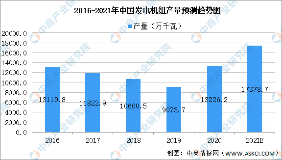 一般我們常見的發(fā)電機(jī)組通常由汽輪機(jī)、水輪機(jī)或內(nèi)燃機(jī)(汽油機(jī)、柴油機(jī)等發(fā)動(dòng)機(jī))驅(qū)動(dòng),可再生新能源包括核能、風(fēng)能、太陽能、生物質(zhì)能、海洋能等。數(shù)據(jù)顯示,我國發(fā)電機(jī)組產(chǎn)量呈波動(dòng)趨勢(shì),2020年我國發(fā)電機(jī)組產(chǎn)量達(dá)13226.2萬千瓦,預(yù)計(jì)2021年我國發(fā)電機(jī)組產(chǎn)量可達(dá)17378.7萬千瓦。