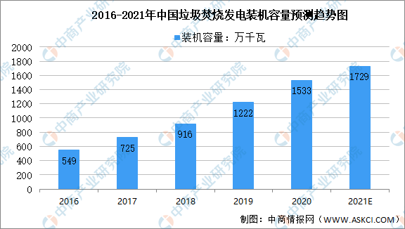 數(shù)據(jù)顯示,我國垃圾焚燒發(fā)電裝機(jī)容量由2016年549萬千瓦增至2020年1533萬千瓦,年均復(fù)合增長(zhǎng)率為29.27%。中商產(chǎn)業(yè)研究院預(yù)測(cè),2021年垃圾焚燒發(fā)電裝機(jī)容量可達(dá)1729萬千瓦。