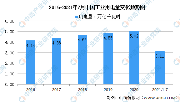 數(shù)據(jù)顯示,2021年1-7月,工業(yè)用電量達(dá)3.11萬億千瓦時(shí)。第一產(chǎn)業(yè)用電量102億千瓦時(shí),同比增長(zhǎng)20.0%;第二產(chǎn)業(yè)用電量5068億千瓦時(shí),同比增長(zhǎng)9.3%;第三產(chǎn)業(yè)用電量1422億千瓦時(shí),同比增長(zhǎng)21.6%;其中,7月工業(yè)用電量達(dá)4972億千瓦時(shí)。