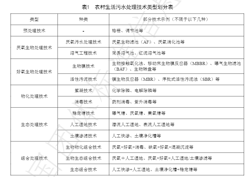 4.5按農(nóng)村生活污水處理技術特點將常用的單元技術劃分為預處理技術、生物處理技術、物化處理技術、生態(tài)處理技術和組合處理技術。技術類型劃分見表1。