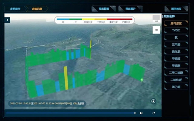 此次走航期間,僅發(fā)現(xiàn)2處臭氣濃度監(jiān)測數(shù)值相對較高的區(qū)域。第一個高值區(qū)域為某新材料公司二期廠區(qū),走航車經(jīng)過該區(qū)域時,走航地圖顯示臭氣濃度以黃色柱形圖顯示,屬輕度污染,結合導出的走航數(shù)據(jù)發(fā)現(xiàn),該區(qū)域的臭氣濃度監(jiān)測因子最高值達到13(OU),雖未超標,但略高于其他區(qū)域監(jiān)測數(shù)值;第二個高值區(qū)域為某氣體生產(chǎn)單位廠區(qū)附近,現(xiàn)場人員經(jīng)過該區(qū)域時能夠聞到空氣中的臭味,因此在該區(qū)域進行了短暫的停留,后結合導出的走航地圖及走航數(shù)據(jù)發(fā)現(xiàn),該區(qū)域的臭氣濃度監(jiān)測因子數(shù)值最高達到19(OU),也未超過國家二級標準規(guī)定的20(OU)濃度要求。綜合分析,本次走航監(jiān)測區(qū)域整體空氣質(zhì)量較為優(yōu)良,無長時間、氣味明顯的惡臭污染,但應該針對某新材料公司和某氣體生產(chǎn)企業(yè)進行重點監(jiān)控。本次走航監(jiān)測,為當?shù)丨h(huán)境部門進行重點區(qū)域惡臭污染排查提供了可靠的數(shù)據(jù)支撐,對于敦促企業(yè)進行整改、確保該市環(huán)境空氣質(zhì)量維持優(yōu)良水平貢獻出了一份力量。