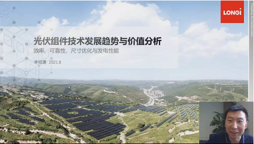 隆基樂(lè)葉光伏高級(jí)產(chǎn)品經(jīng)理李紹唐博士帶來(lái)了主題為《光伏組件技術(shù)發(fā)展趨勢(shì)與價(jià)值分析——效率,可靠性,尺寸優(yōu)化與發(fā)電性能》的分享