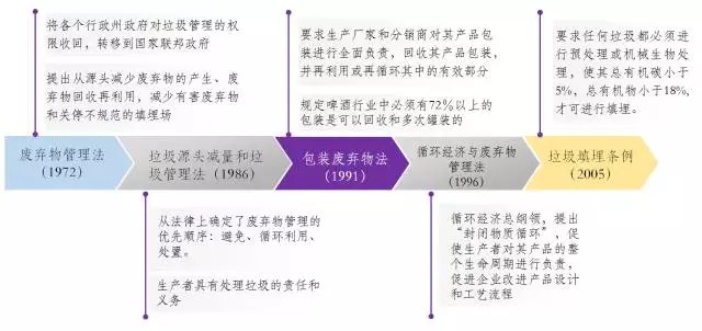 1991年頒布的《包裝廢棄物法》將包裝廢棄物的收集和處理責(zé)任從過去的各個行政州政府分?jǐn)偨o了各生產(chǎn)廠家、分銷商等企業(yè)機(jī)構(gòu),要求生產(chǎn)廠家和分銷商回收其產(chǎn)品包裝,并進(jìn)行再利用,該法催生了德國著名的“二元回收系統(tǒng)”(即“綠點公司”),與公共環(huán)衛(wèi)回收系統(tǒng)平行運(yùn)作。