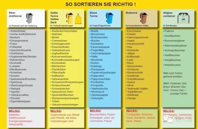德國生活垃圾分類多采用“五分法”,即將生活垃圾分為以下五大類分別扔入不同顏色垃圾桶:棕色桶裝有機(jī)垃圾(包括剩飯剩菜、果皮骨頭等廚余垃圾,庭院綠化垃圾);黃色桶(或袋)裝輕型包裝(如塑料袋,包裝盒,牛奶盒等);藍(lán)色桶收集廢紙與廢紙箱;廢玻璃經(jīng)過分類后分別投入棕色、白色、綠色三種顏色的垃圾桶;剩余黑色或灰色的桶,用來收集所有居民分到無法再分的剩余垃圾。