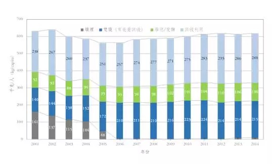2014年,全德國生活垃圾產(chǎn)生總量為5110萬噸,人均生活垃圾產(chǎn)生量約618kg/a(1.69kg/d),其中剩余垃圾量(即未回收的垃圾)只占到人均生活垃圾產(chǎn)生量的36%,總回收率為64%。