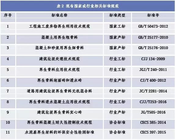 目前,建筑垃圾管理與資源化標(biāo)準(zhǔn)體系正在建設(shè)中,現(xiàn)有的建筑垃圾資源化利用及再生產(chǎn)品生產(chǎn)與應(yīng)用相關(guān)國家及行業(yè)標(biāo)準(zhǔn)規(guī)范有11項,在編的相關(guān)標(biāo)準(zhǔn)規(guī)范有5項(詳見表2、表3),其中強(qiáng)制性標(biāo)準(zhǔn)條文不多,在某種程度上制約了再生產(chǎn)品的生產(chǎn)、使用和推廣。