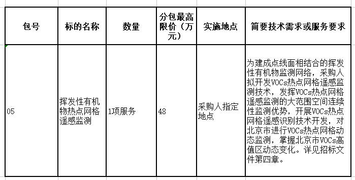 北京市揮發(fā)性有機(jī)物解析能力建設(shè)一期(中央資金)-揮發(fā)性有機(jī)物熱點(diǎn)網(wǎng)格遙感監(jiān)測(cè)公開招標(biāo)公告