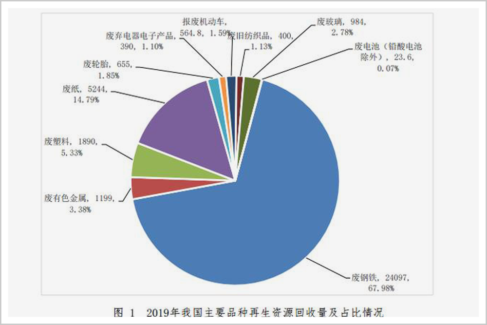 據(jù)商務(wù)部《中國(guó)再生資源回收行業(yè)發(fā)展報(bào)告(2020)》,我國(guó)可再生資源回收主要集中在廢鋼鐵、廢有色金屬、廢塑料、廢輪胎、廢紙、廢棄電器電子產(chǎn)品、報(bào)廢機(jī)動(dòng)車、廢舊紡織品、廢玻璃、廢電池等領(lǐng)域,2019年底,它們的回收總量超過(guò)3.5億噸。