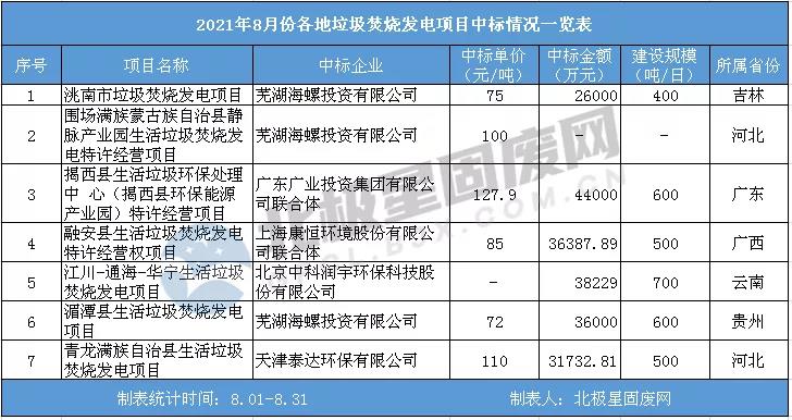 8月垃圾焚燒發(fā)電項目中標(biāo)匯總?cè)缦拢?/span>