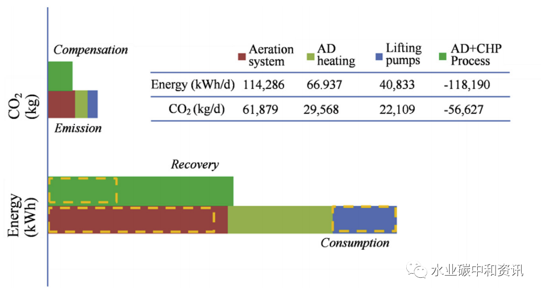 另一方面,污水中余溫熱能可以通過水源熱泵轉化出熱量,以平衡能量赤字,甚至達到碳中和。一項關于污水處理廠(普遍COD = 200 ~ 400 mg/L)能量平衡評估表明,中國剩余污泥厭氧消化產甲烷只能彌補約50%的運行能量消耗(Hao et al.)。進一步研究表明,水源熱泵能夠有效轉化污水熱能,用以加熱污水處理廠及其周邊建筑,可提供約0.20 kWh·m-3·℃-1 凈電當量。總的來說,中國有機物及熱能能夠有效供給充足的電當量,足以達到碳中和運行目標。污水處理廠能耗及碳排放情況