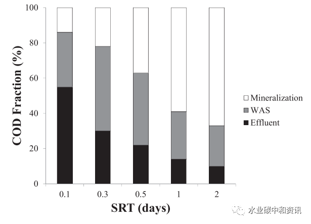 在較SRT和HRT下運行時,產量接近其最大值,因而可在接近最大污泥產率情況下,可最優(yōu)地利用COD產出生物質。在這些運行條件下,與傳統(tǒng)HRAS工藝相比,其去除大部分(50~80%)進水COD時所需求的曝氣量減少近60%。