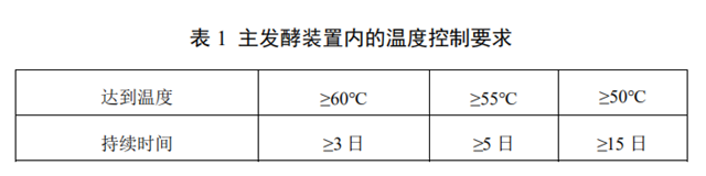 c)主發(fā)酵裝置內(nèi)的溫度及持續(xù)時間應滿足表1的要求。采用密閉式堆肥反應器時,宜在反應器中心與距反應器內(nèi)壁100 mm處各設(shè)2個測溫點,溫度按測溫點均值計,溫度需連續(xù)記錄。采用半密閉式和敞開條垛或槽式堆肥時,宜在條垛或槽式堆肥的長度方向每間隔5m橫截面的中心與距表面和底部100 mm處各設(shè)1個測溫點,溫度按測溫點均值計,間隔2小時記錄溫度1次。