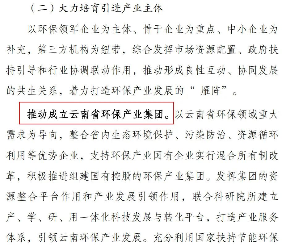 不過,這個“福建省生態(tài)環(huán)保集團(tuán)”到底什么時候組建完成,其中都包括什么內(nèi)容,一切具體的信息就都不知道了。還有云南,今年7月,云南省發(fā)布《云南省“十四五”環(huán)保產(chǎn)業(yè)發(fā)展規(guī)劃(征求意見稿)》,其中提到,要推動成立云南省環(huán)保產(chǎn)業(yè)集團(tuán)。以云南省環(huán)保領(lǐng)域重大需求為導(dǎo)向,整合省內(nèi)生態(tài)環(huán)境保護(hù)、污染防治、資源循環(huán)利用等優(yōu)勢企業(yè),支持環(huán)保產(chǎn)業(yè)國有企業(yè)實(shí)行混合所有制改革,積極推進(jìn)組建國有控股的環(huán)保產(chǎn)業(yè)集團(tuán)。