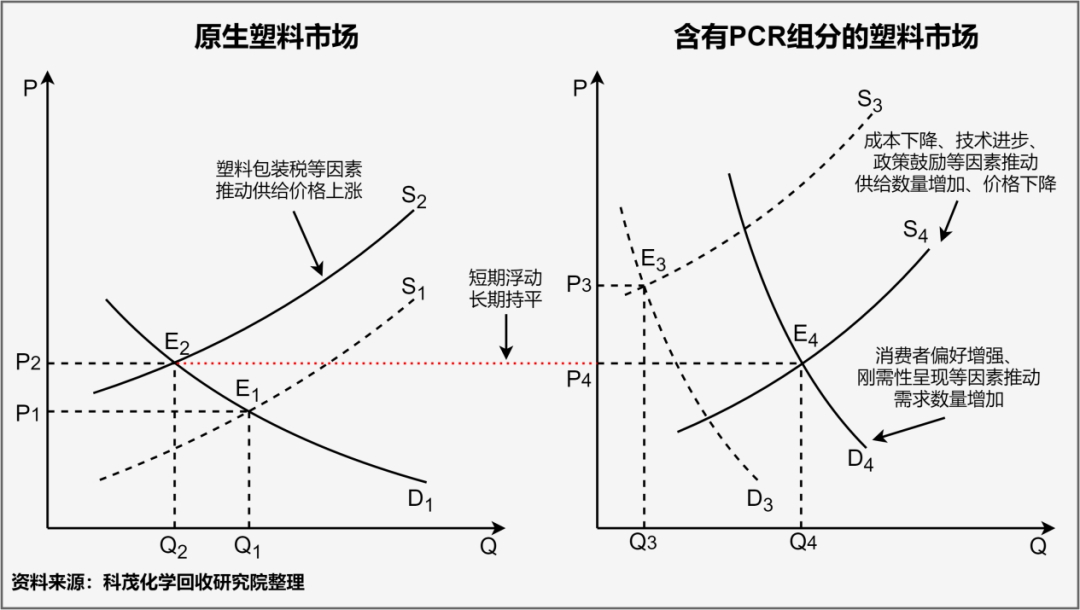 過去由于化學回收技術水平低、生產(chǎn)成本高、政策支持少、市場預期低等因素,導致PCR塑料供應數(shù)量少、價格高;同時由于剛性需求尚未呈現(xiàn)、消費者偏好不足、替代品(純原生塑料)價格低等因素,導致PCR塑料需求數(shù)量少,因此含化學回收PCR組分塑料市場的理論均衡點E3在現(xiàn)實中幾乎不存在。近年來供需要素變化,使含PCR組分塑料的理論均衡價格從過去不可接受的程度,下降至現(xiàn)在雖然較高但可以接受的水平。