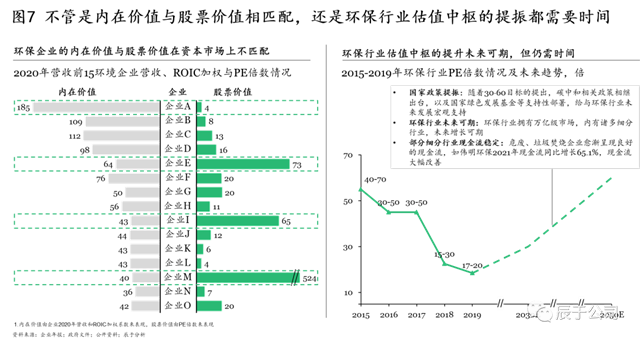 但必須承認(rèn)的是,向好趨勢的背后,我國資本市場的制度完善仍需時(shí)間。首先是生態(tài)環(huán)保企業(yè)內(nèi)在價(jià)值與股票價(jià)值的相匹配需要時(shí)間,在對生態(tài)環(huán)保企業(yè)2020年?duì)I收前15強(qiáng)的營收、ROIC加權(quán)和PE倍數(shù)進(jìn)行分析得到,多數(shù)企業(yè)(如企業(yè)A、E、I、M)的內(nèi)在價(jià)值與股票價(jià)值在資本市場上并不匹配。其次是生態(tài)環(huán)保估值中樞的提升仍需時(shí)日,盡管隨著國家政策的提振、生態(tài)環(huán)保行業(yè)的發(fā)展、部分細(xì)分行業(yè)企業(yè)現(xiàn)金流狀況的改善,環(huán)保估值中樞提升未來可期,但也并不是一蹴而就的(見圖7)。