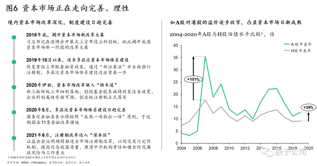政策推動下,國內(nèi)資本市場改革逐步深化,制度建設(shè)日趨完善,生態(tài)環(huán)保企業(yè)面臨的資本市場大環(huán)境正走向理性。A股對H股的溢價(jià)逐步收窄便是其中一佐證:基于對95家同時(shí)在A股和港股上市的企業(yè)的分析,可以看到相比于2006年最高峰時(shí)A股對H股超過100%的溢價(jià),當(dāng)前30%-40%的溢價(jià)已有明顯收窄(見圖6)。