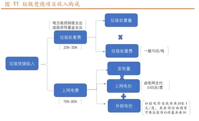 垃圾焚燒運(yùn)營(yíng)收入主要來自于上網(wǎng)電費(fèi)(向電網(wǎng)收取)和垃圾處理費(fèi)(向政府收?。?,上網(wǎng)電費(fèi)一般占比 70%~80%,垃圾處理費(fèi)一般占比 20%~30%。