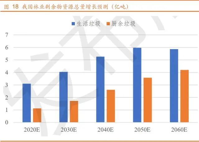 根據(jù)國(guó)家林草局發(fā)布的《中國(guó)林業(yè)和草原統(tǒng)計(jì)年鑒》數(shù)據(jù),目前我國(guó)林 業(yè)面積約為17988.85萬公頃,森林覆蓋率達(dá)到22.96%,年采伐木材10045.85 萬立方米,由此測(cè)算出林業(yè)廢棄物資源量約為 3.5 億噸。林業(yè)碳匯是最為重 要的固碳手段,預(yù)計(jì)未來我國(guó)林業(yè)面積將會(huì)保持穩(wěn)定增長(zhǎng)。根據(jù)近 20 年《中 國(guó)林業(yè)和草原統(tǒng)計(jì)年鑒》數(shù)據(jù)分析,林業(yè)采伐總資源量保持 2%的增長(zhǎng),預(yù)計(jì) 未來林業(yè)剩余物資源量也將隨之持續(xù)增加。預(yù)計(jì) 2030 年林業(yè)剩余物總量將達(dá) 到 4.27 億噸,到 2060 年,林業(yè)剩余物總量將達(dá)到 7.73 億噸。