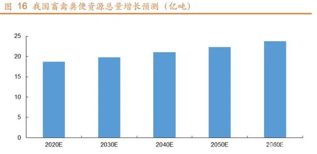 廣義上畜禽糞便為畜禽排出的糞尿?yàn)橹?。目前,根?jù)《中國(guó)農(nóng)業(yè)年鑒》、 《中國(guó)農(nóng)村統(tǒng)計(jì)年鑒》、《中國(guó)畜牧獸醫(yī)年鑒》以及國(guó)家統(tǒng)計(jì)局最新畜禽存欄 數(shù)據(jù)測(cè)算,我國(guó)畜禽糞便資源量共計(jì) 18.68 億噸(不包含沖洗廢水)。根據(jù)年 鑒統(tǒng)計(jì)數(shù)據(jù),近年來我國(guó)主要畜禽類存欄量呈現(xiàn)小幅震蕩,雖然在 2019 年到 低點(diǎn)后因擴(kuò)大豬肉供給大幅反彈,總體上還是受短期市場(chǎng)因素影響。預(yù)計(jì)未 來肉蛋奶消費(fèi)市場(chǎng)將趨于飽和,畜禽糞便資源量保持在固定區(qū)間內(nèi),畜禽糞 便資源量將保持 0.6%的較低增長(zhǎng)趨勢(shì)。預(yù)計(jì) 2030 年畜禽糞便資源總量約為 19.83 億噸;2060 年畜禽糞便資源總量約為 23.73 億噸。
